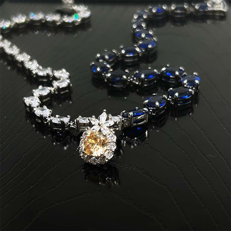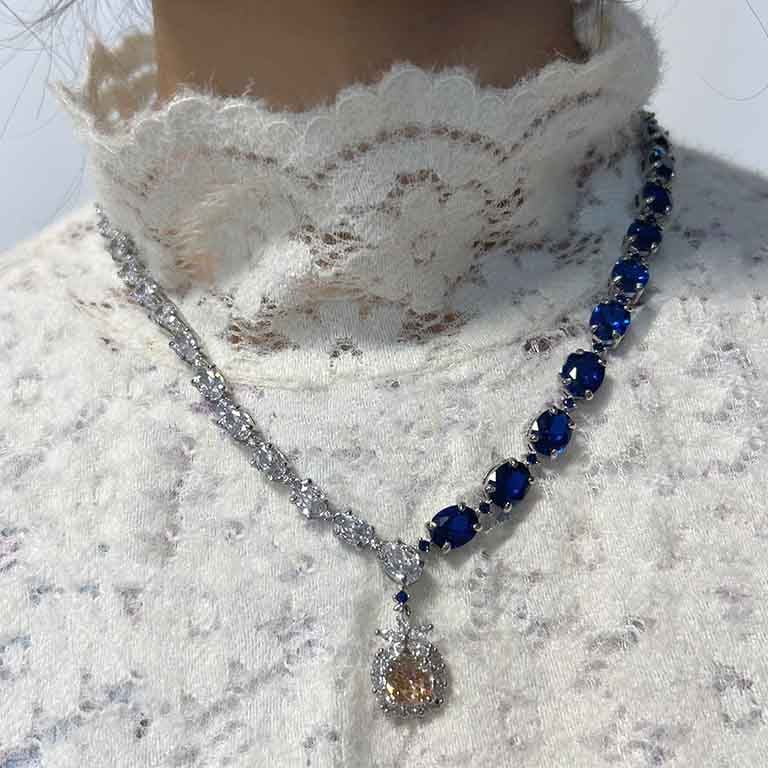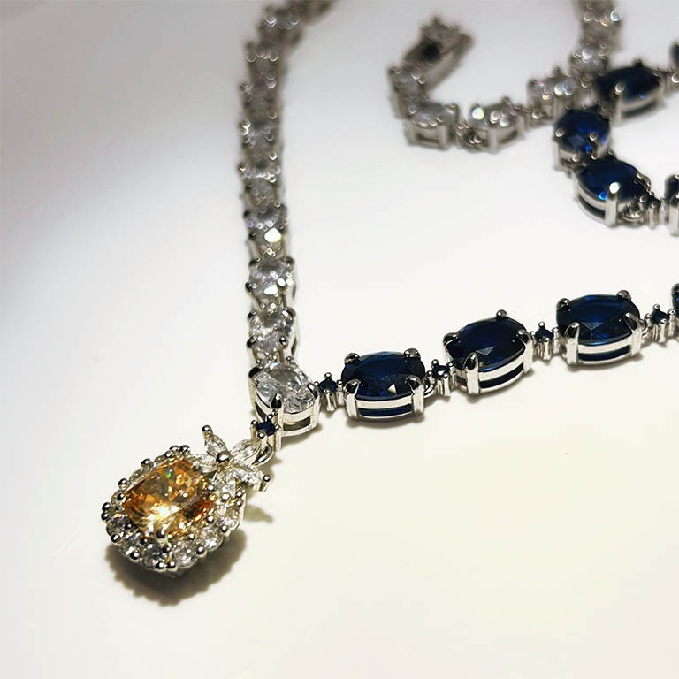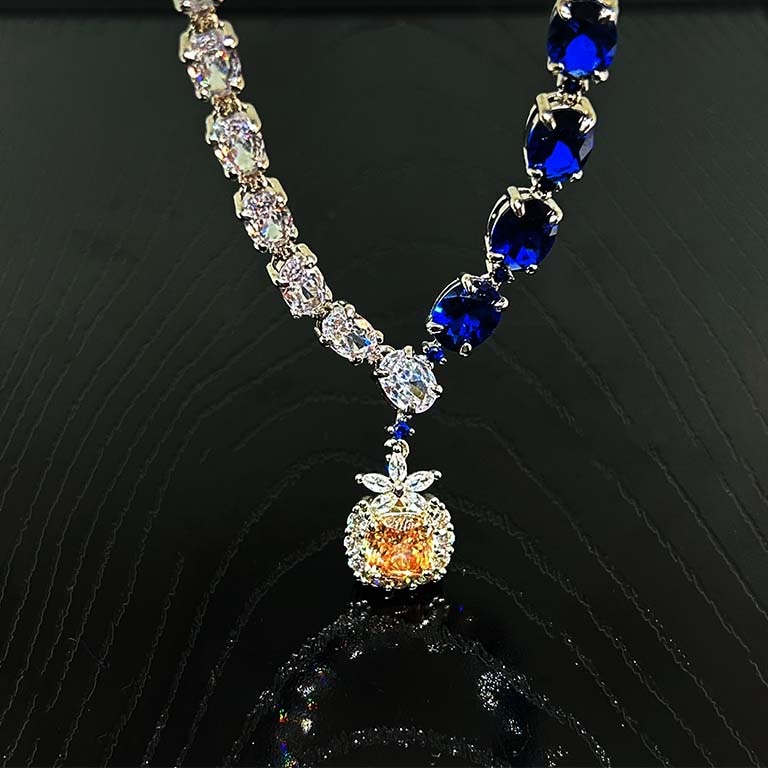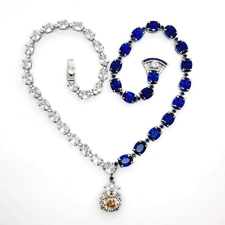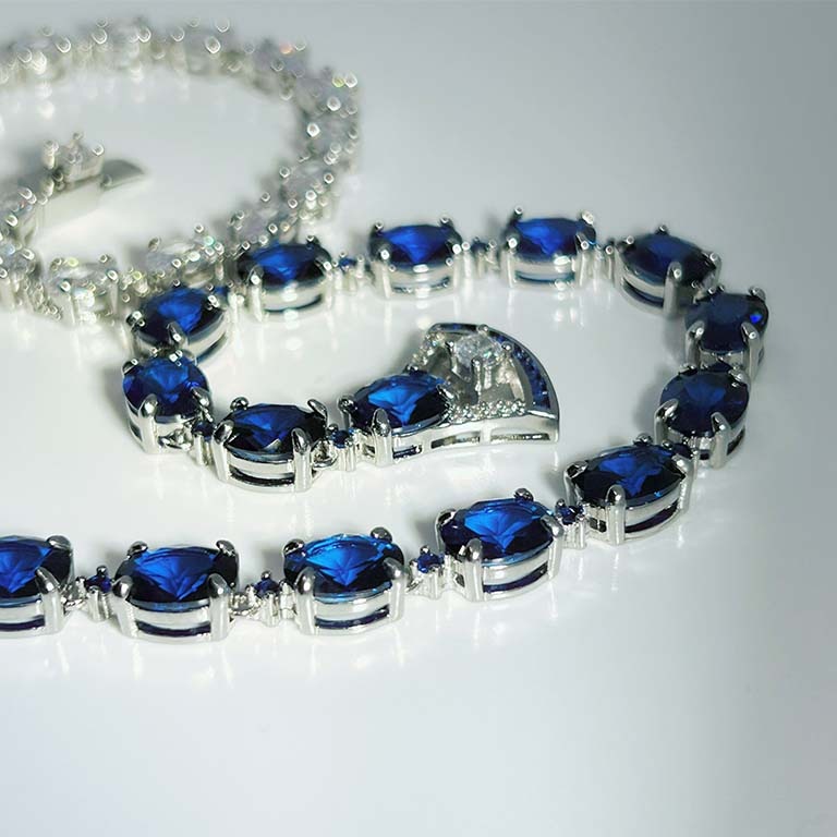 | 主石 | ブルー宝石:合成ブルースピネル 9mmx7.5mm,17石 ペンダント:AAAジルコニア 8.5mm 白宝石:AAAジルコニア 7mmx5mm, 23石 ☆☆☆☆ |
