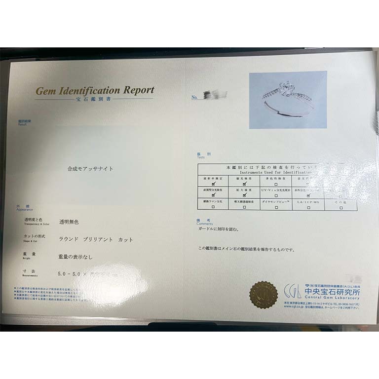 当店では、仕入れた全ての宝石に対して厳格な再鑑定を行い、品質の確認を徹底しております。その過程で、信頼性の高い証書が製品の価値を保証するために重要であると再認識しました。手元にGRA鑑定書が付いている商品についても、当店での鑑定によりモアサナイトであることが確認された場合に限り、CGL鑑別書を新たに手配いたします。今後とも、信頼のおける証明書を通じて、より高い品質をお届けできるよう努めてまいります。