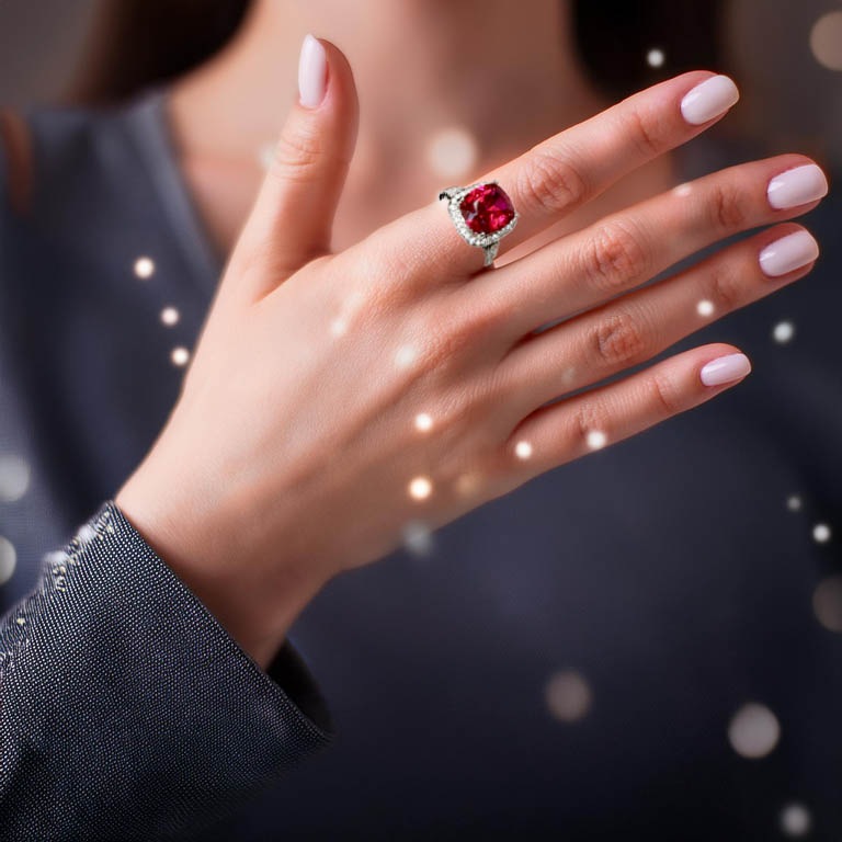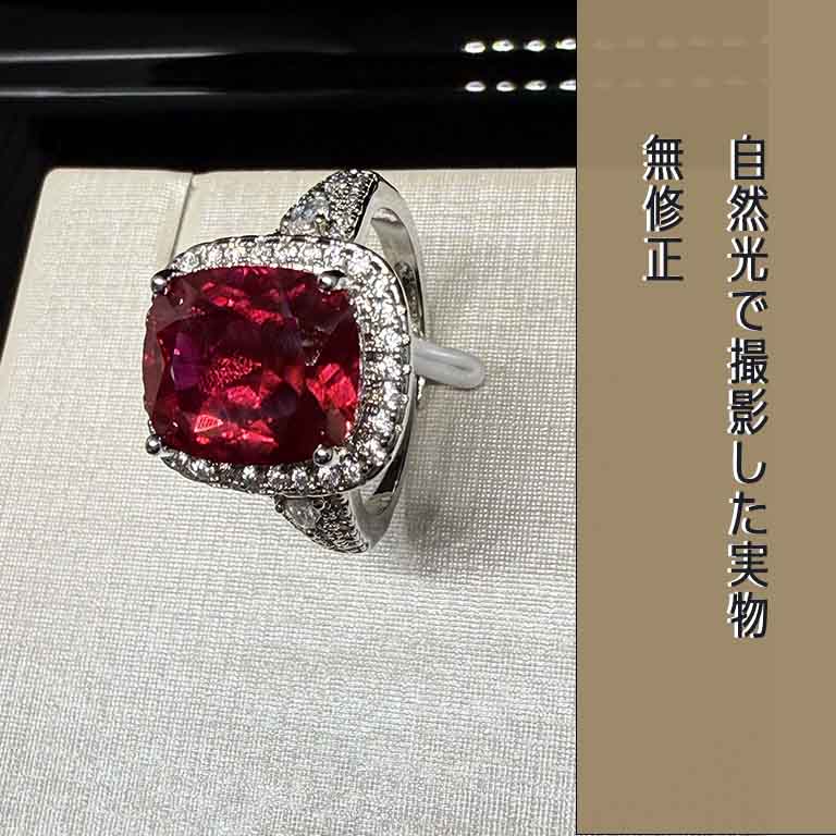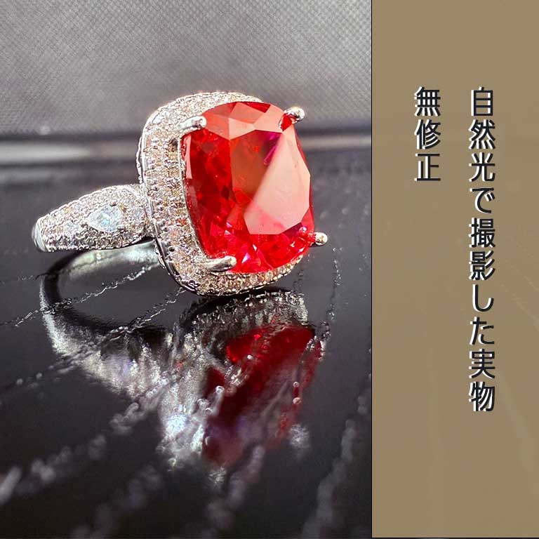 主石はラボグロウン合成ルビーで、天然ルビーと同じ鉱物成分であるコランダムです。赤色も天然と同じクロムによるもので、硬度は9です。さらに、赤色の蛍光反応も示します。