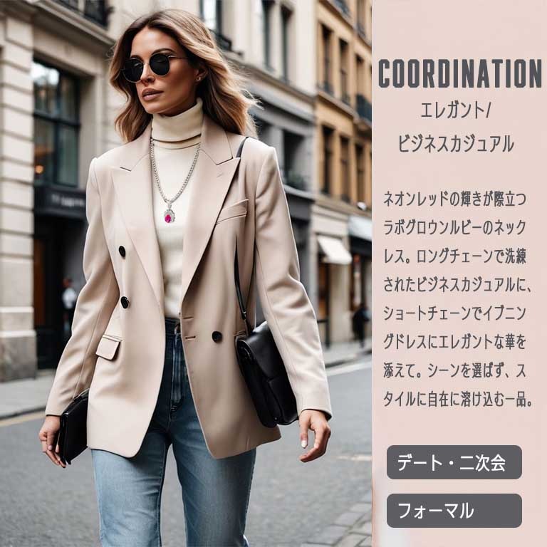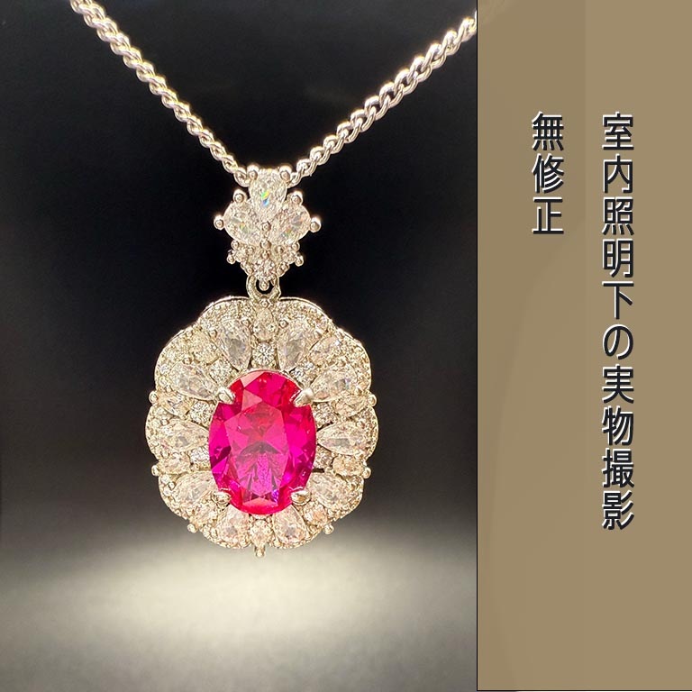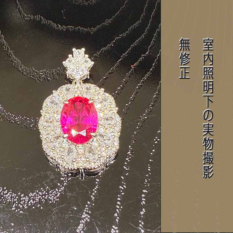 主石はラボグロウン合成ルビーで、天然ルビーと同じ鉱物成分であるコランダムです。赤色も天然と同じクロムによるもので、硬度は9です。さらに、赤色の蛍光反応も示します。